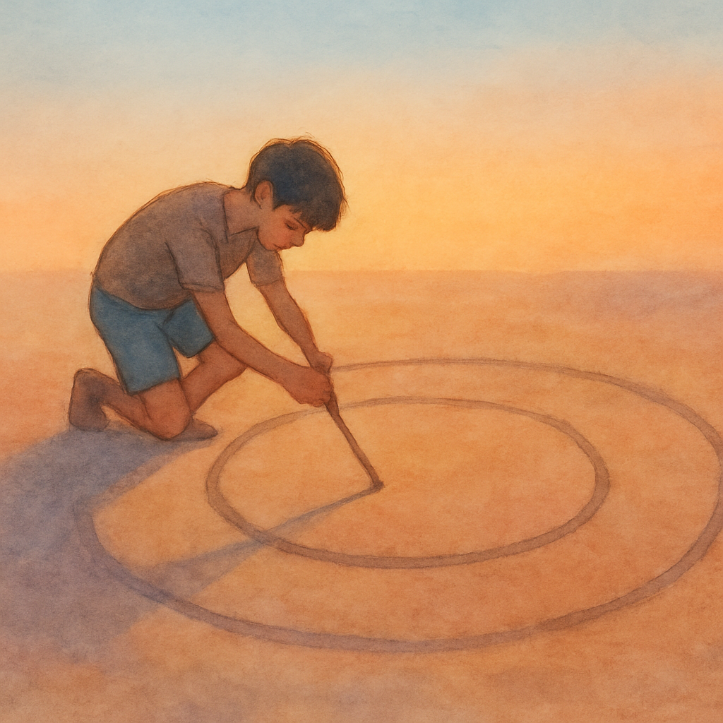 تمسك بعود طويل من الخشب وترسم دائرة عملاقة على التراب ..